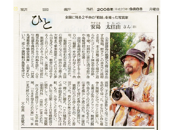 朝日新聞の「ひと」欄に、私の47都道府県の戦跡を訪ね歩く活動と写真集『要塞列島』出版の情報が紹介されました。