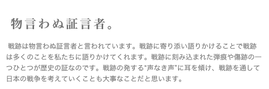 戦跡といっても政府や陸海軍関係の建物から要塞や飛行場、軍港、掩体壕、トーチカ、地下壕、防空壕、兵器工場、特攻基地、そして戦闘地や戦場、原爆や空襲避害の建物など多岐にわたります。これらの戦跡を貴重な戦争遺産として大事に保存して後世に伝えていくことも大切なことだと考えます。